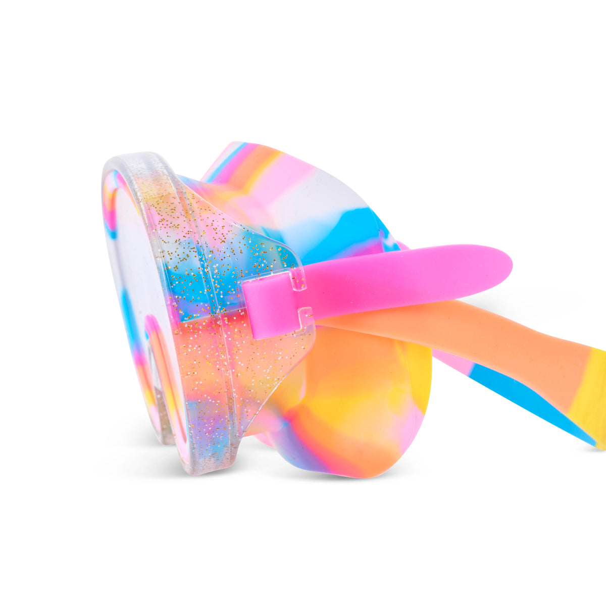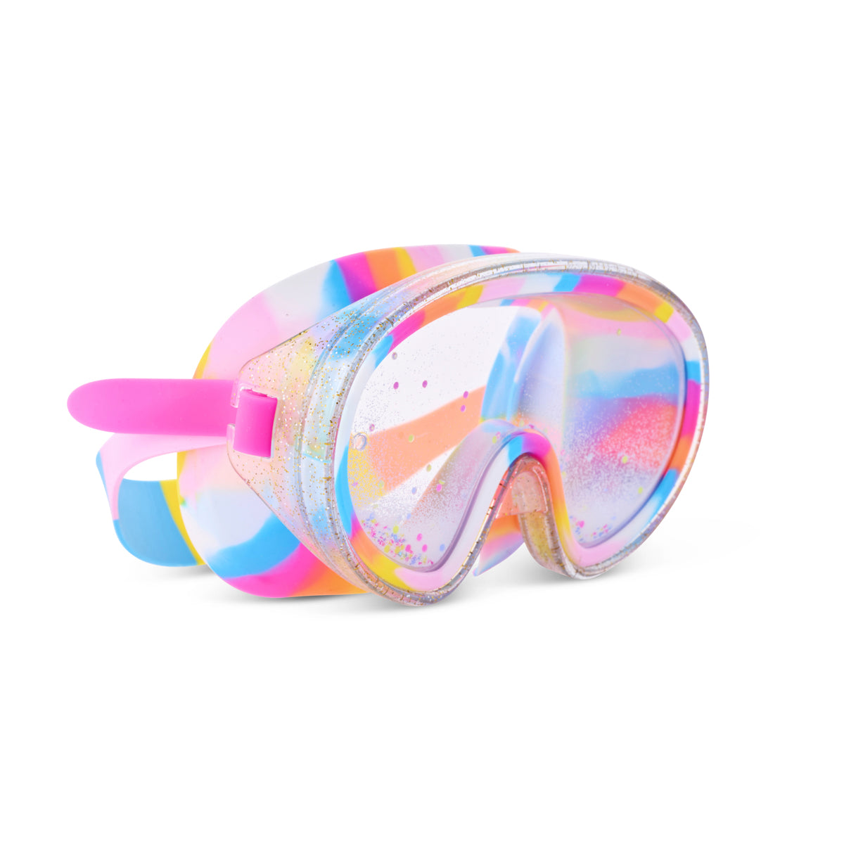 Come ride the Crystal Current— where fantasy meets function in our Candy Coral swim mask. Designed to spark imagination, this mask features a unique double-walled lens with floating glitter, giving just the right shimmer without blocking vision.